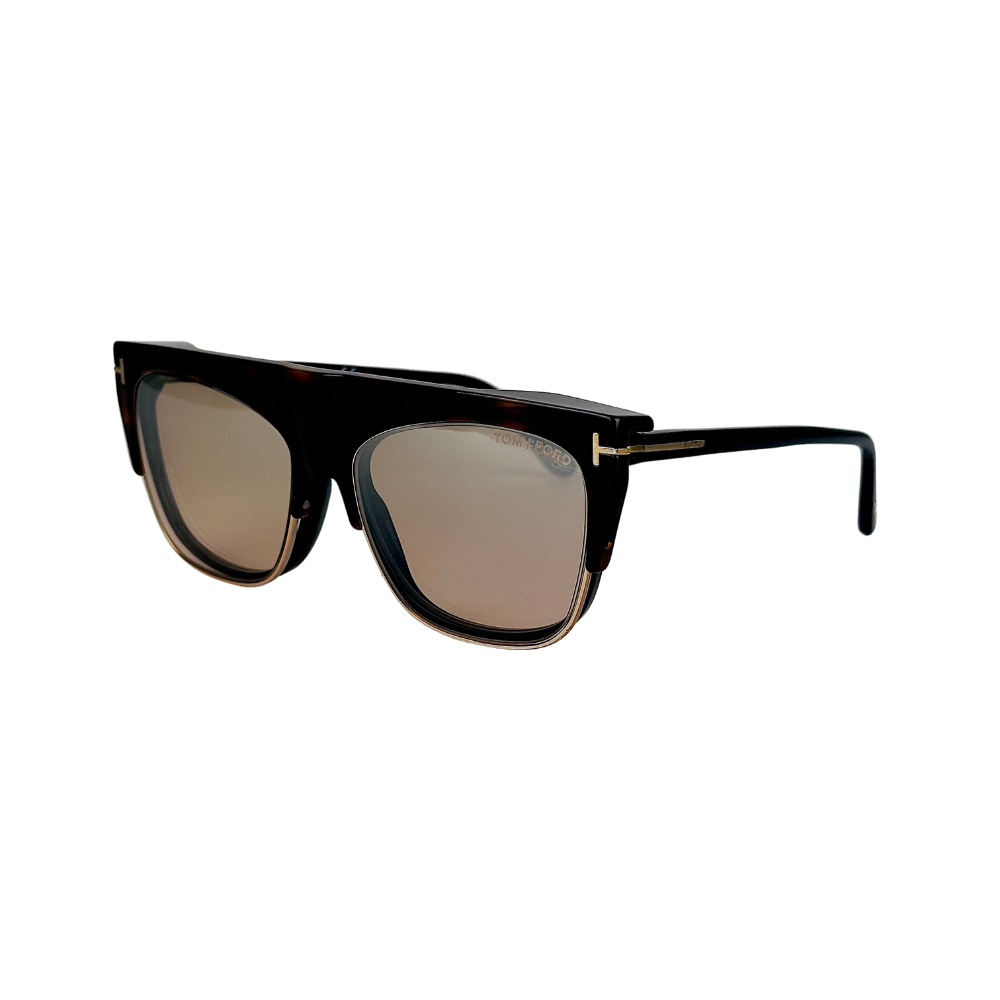 Este óculos Clip On da Tom Ford destaca-se pelo design ousado e sofisticado. A armação retangular gatinho em acetato preto polido é complementada pelo clipon em acetato havana, criando um visual distinto. As lentes espelhadas acrescentam um toque de modernidade.