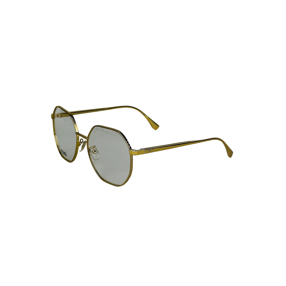 Os óculos de grau FENDI em metal dourado exemplificam o luxo e a inovação característicos da marca italiana. Com um design hexagonal que se destaca pela sua modernidade, o logotipo FF em relevo pela armação adiciona um toque de sofisticação e exclusividade. Um modelo poderoso para quem busca um acessório que combine estilo contemporâneo com detalhes distintivos.