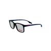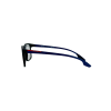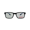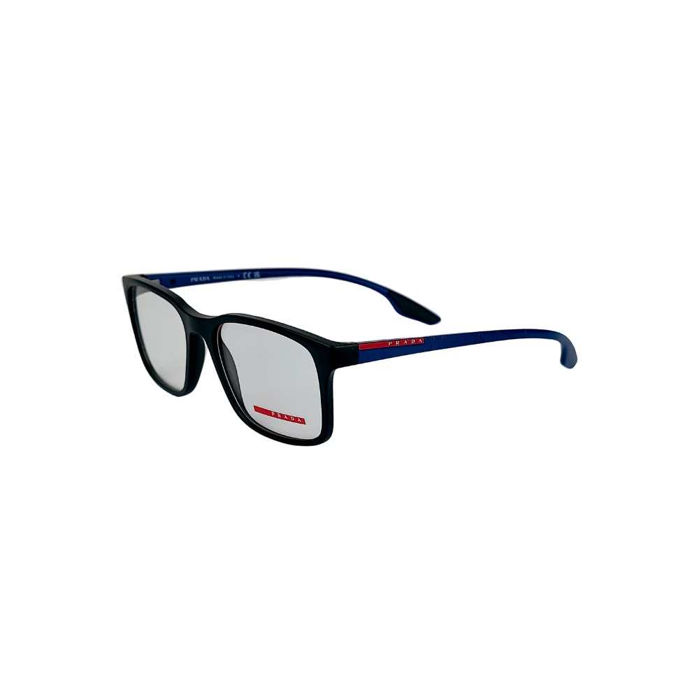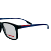 Prada combina estilo moderno e masculinidade com este modelo retangular em preto fosco, realçado por detalhes vermelhos e logo branca sobre hastes azuis, criando um design refinado e contemporâneo.