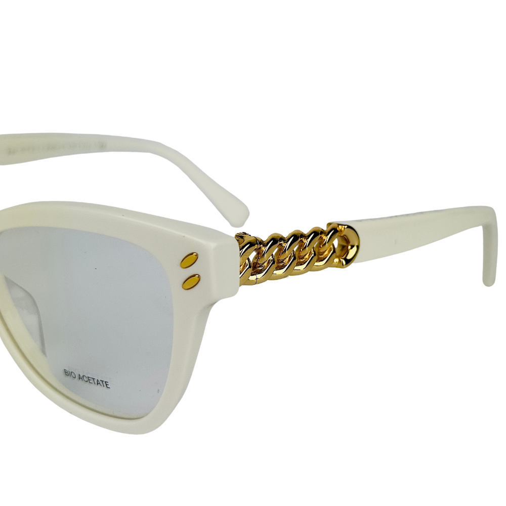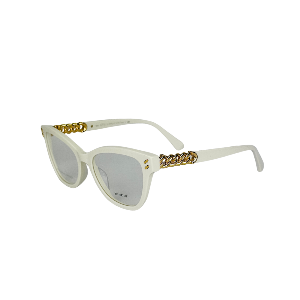 Com um olhar para o futuro da moda sustentável, os óculos de grau Stella McCartney em acetato branco combinam elegância com um design arrojado. O formato retangular gatinho oferece uma interpretação moderna e feminina, enquanto os detalhes de corrente em metal dourado nas hastes acrescentam um toque de sofisticação. Um acessório essencial para aqueles que buscam estilo sem comprometer seus princípios éticos.
