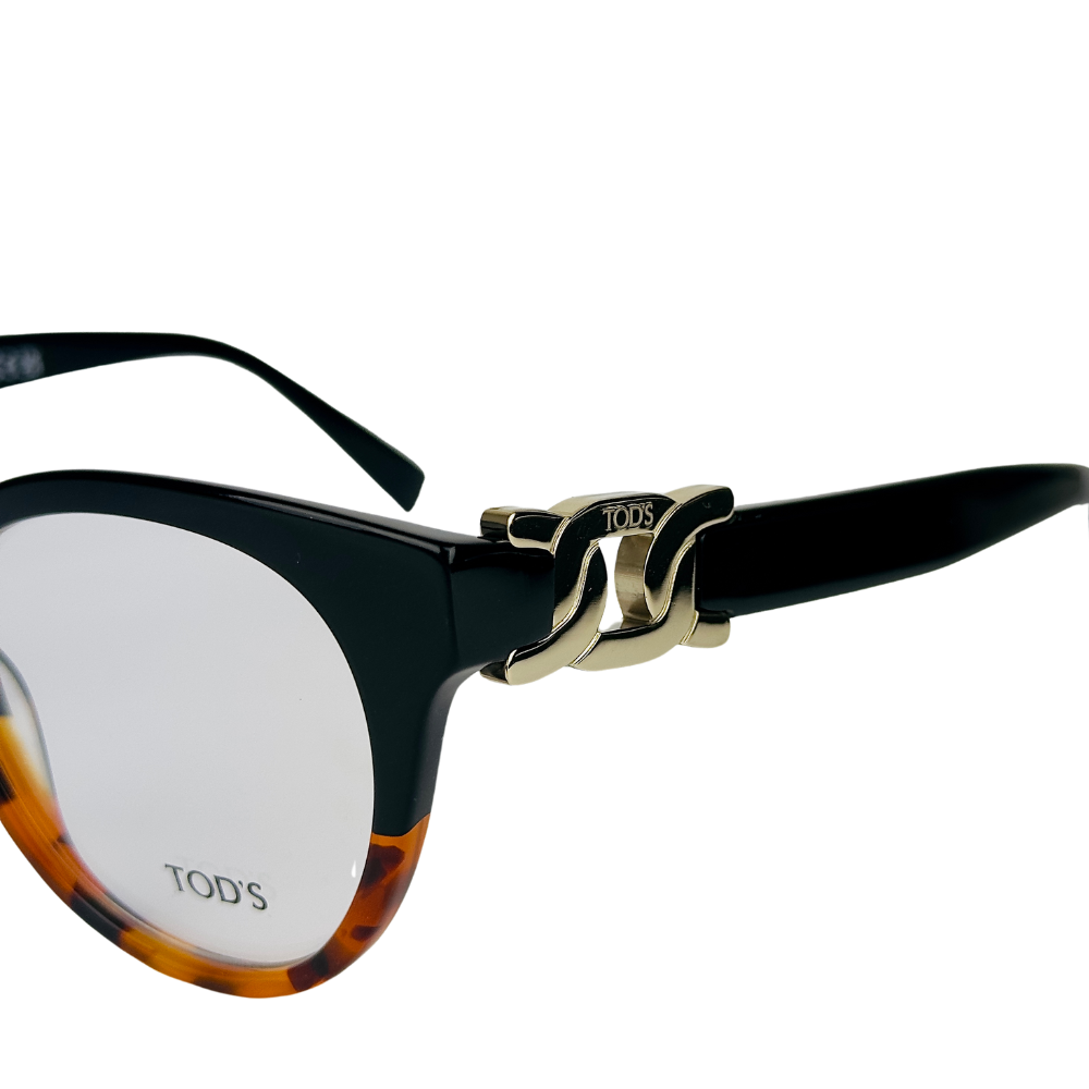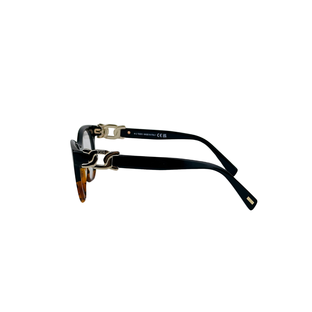 Os óculos de grau Tod’s em acetato preto e havana capturam a essência feminina e moderna da marca italiana, com um design gatinho grande e detalhes elegantes de elos em metal nas hastes em acetato. Ideal para mulheres que buscam um acessório que una estilo ousado com sofisticação clássica.