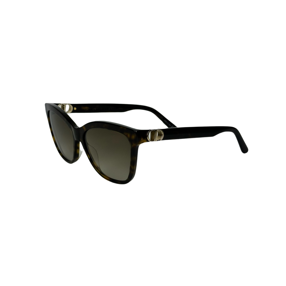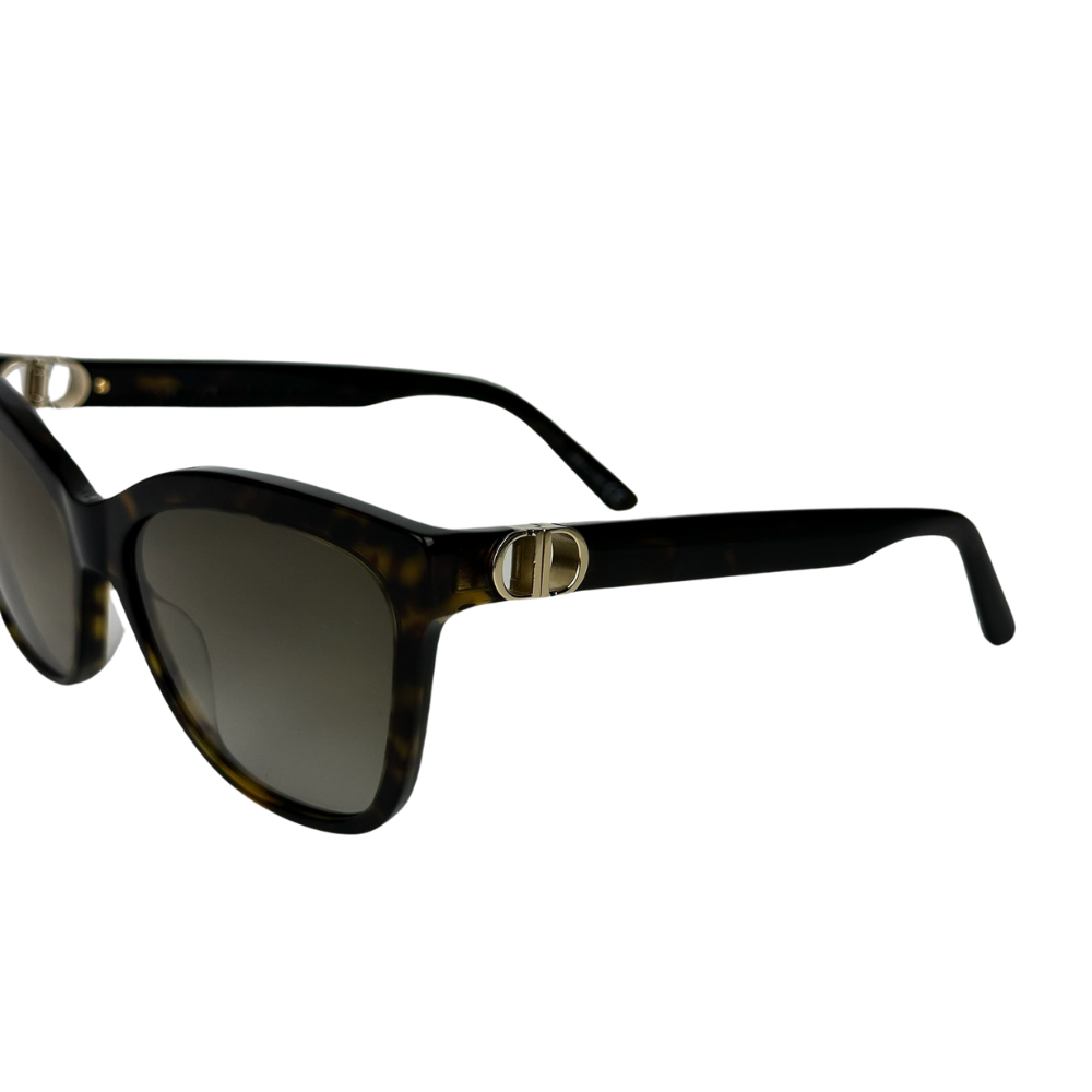 Óculos de sol Dior em acetato havana, modelo quadrado clássico e o distintivo logotipo CD em dourado nas hastes, oferecendo uma interpretação luxuosa do estilo atemporal.