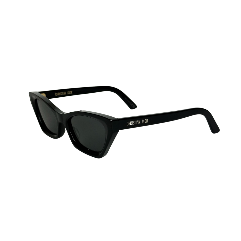 Experimente a sofisticação do Solar Christian Dior gatinho em acetato preto, onde o logotipo CHRISTIAN DIOR nas hastes adiciona um toque de exclusividade e elegância a este design clássico.