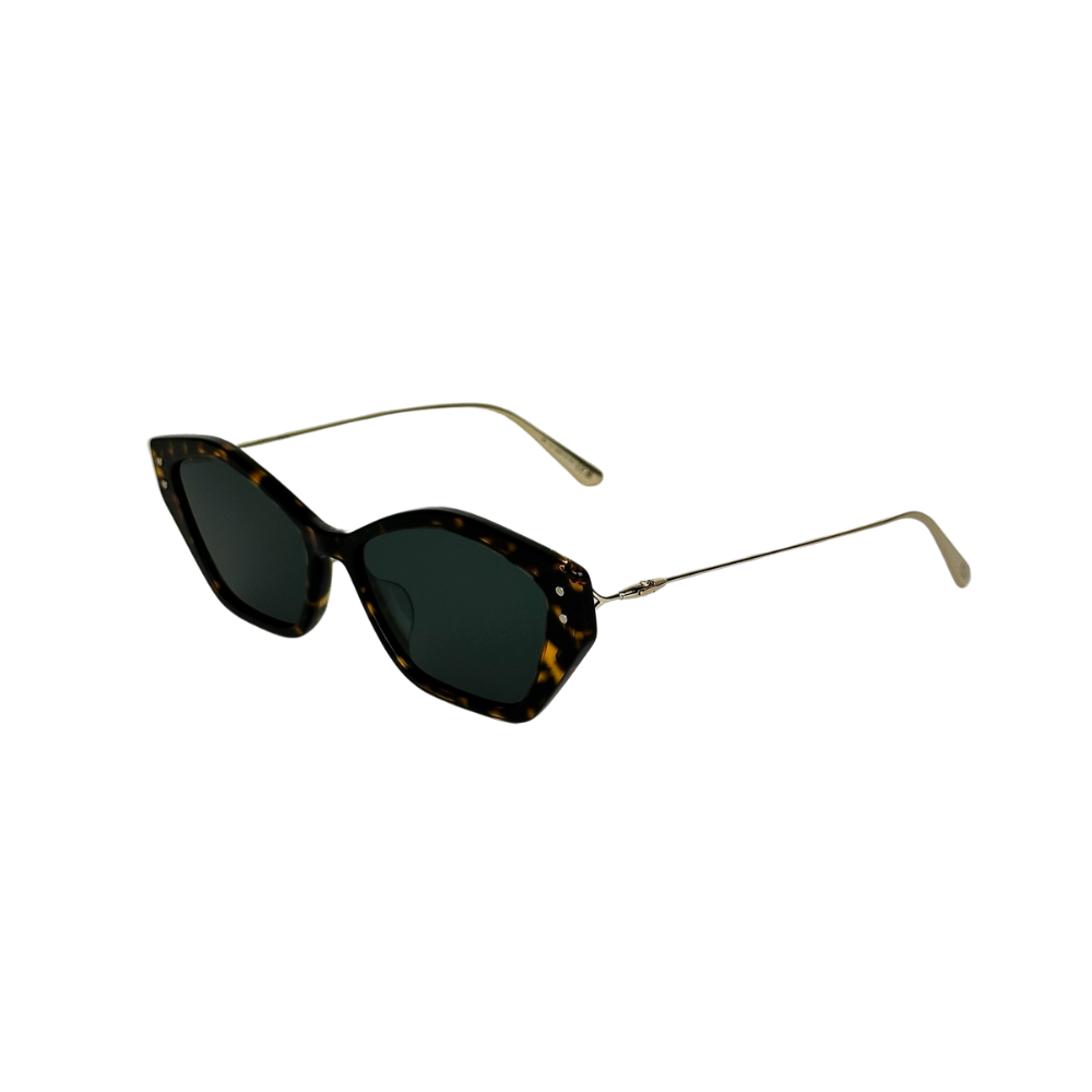 O solar Dior em acetato havana combina o clássico modelo gatinho com hastes em metal dourado, representando a modernidade e a exclusividade inerentes à marca.