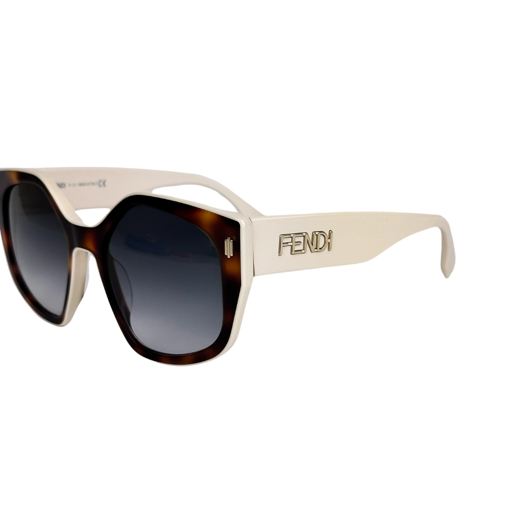 O óculos de sol FENDI em acetato branco off e havana é uma obra-prima de estilo e sofisticação. Com seu design grande, lentes degradê e o logotipo ‘FENDI’ dourado em relevo, é uma declaração de moda poderosa e contemporânea.