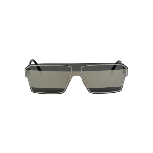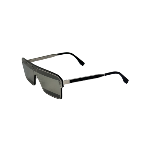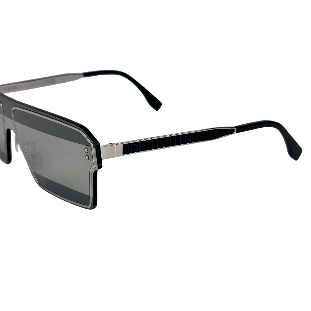 Explore o futuro da moda com o óculos de sol FENDI em metal prata, modelo máscara, destacando-se com lentes espelhadas. Uma peça contemporânea e futurista que redefine os padrões de elegância.