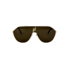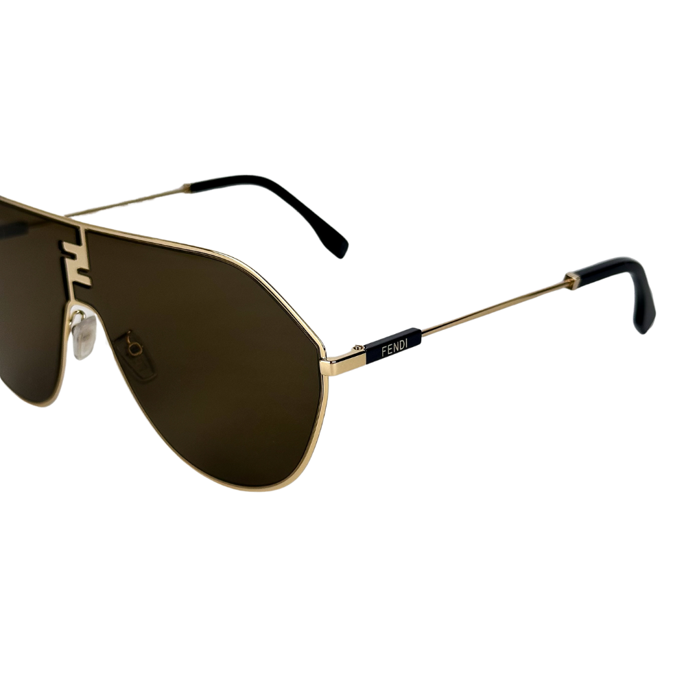 Descubra a ousadia nos óculos de sol Fendi: modelo máscara com logotipo “FF” dourado na lente, complementado pela lente marrom para um estilo poderoso e marcante.