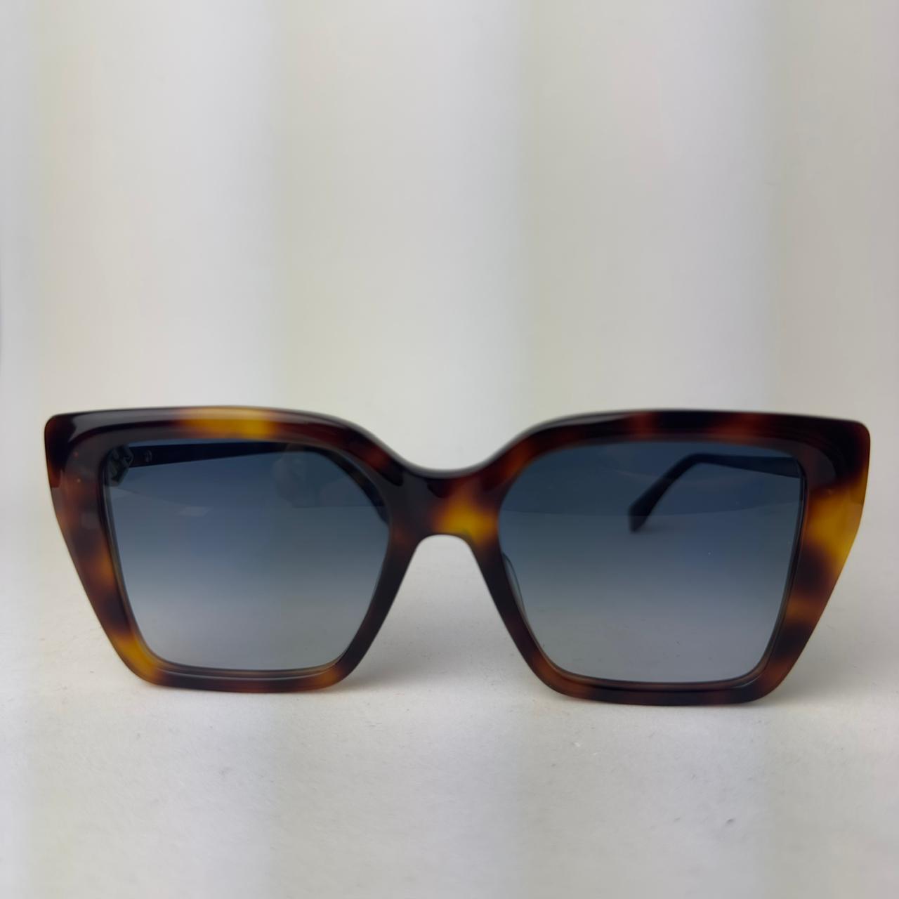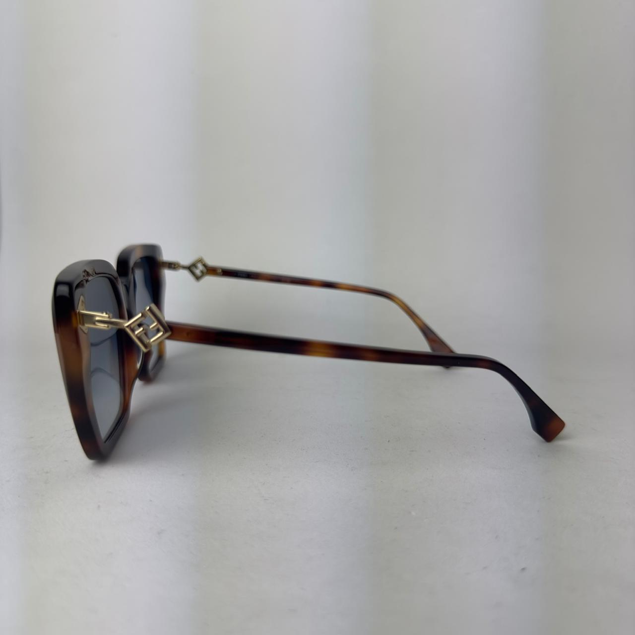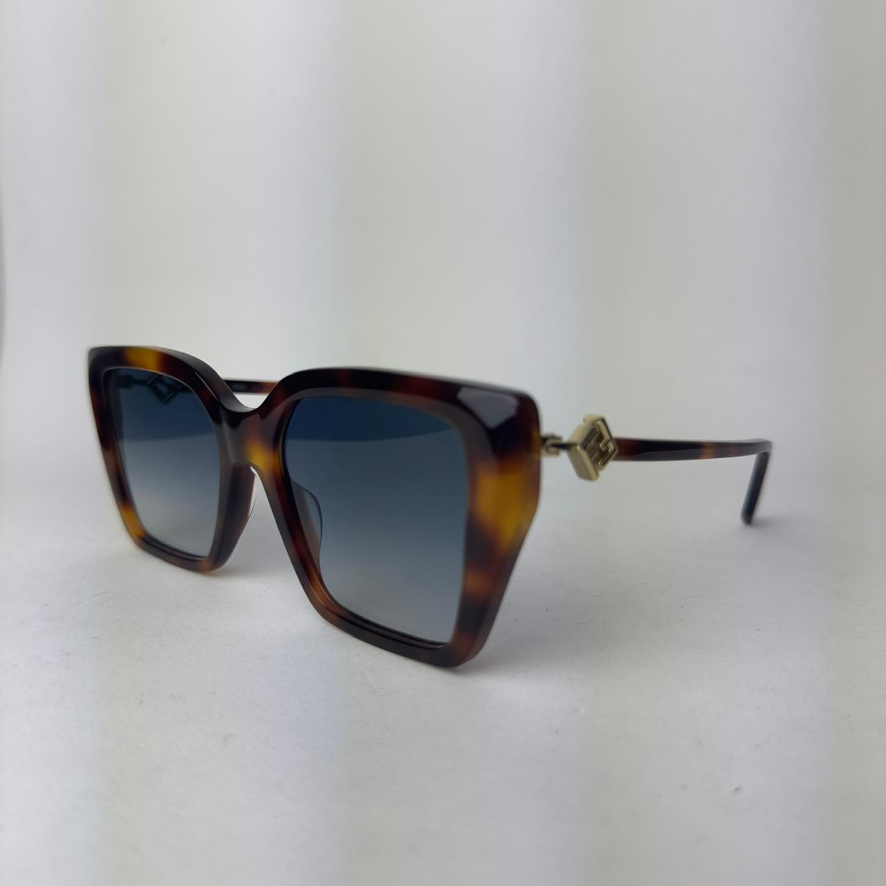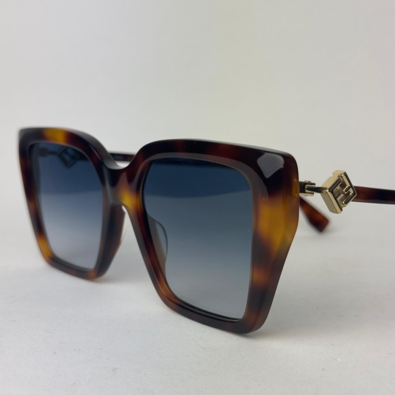 Óculos de sol Fendi em acetato havana, lente degradê cosmética, formato quadrado gatinho e refinado, com detalhes trabalhados nas hastes, um acessório atemporal para qualquer ocasião.