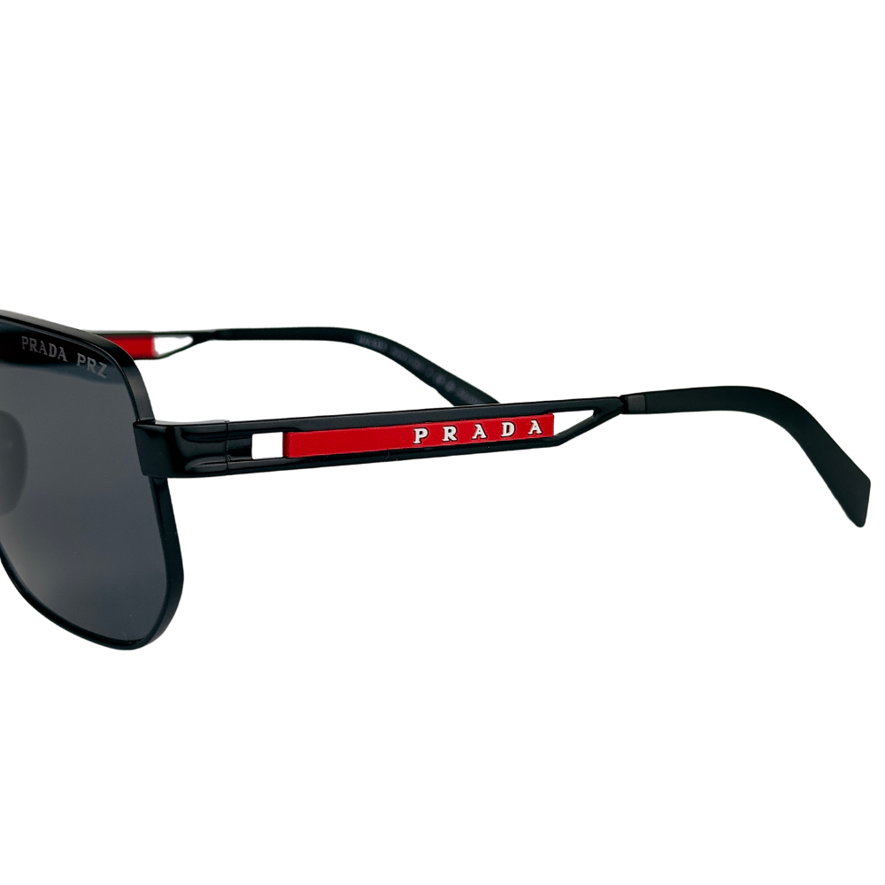 Os óculos de sol Prada apresentam um estilo quadrado em metal preto, realçado por detalhes vermelhos nas hastes e a logo branca, criando um look moderno e elegante com um toque distinto.
